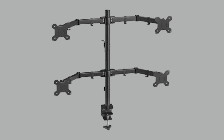 A Quad Monitor Mount is a powerful and ergonomic solution designed to support four monitors in a stable, organized, and space-efficient setup. Ideal for trading desks, programming, gaming, content creation, security monitoring, and professional multitasking, it enhances productivity and viewing comfort. Built from high-quality metal or reinforced materials, it ensures durability and long-term stability for various monitor sizes. Most models feature height adjustment, tilt, swivel, and full 360° rotation, allowing users to customize viewing angles and reduce neck strain. Advanced versions come with gas spring arms for effortless screen adjustments, while others offer a fixed stand with articulating arms for precise alignment. Integrated cable management helps keep wires neatly organized, ensuring a clutter-free workspace. Compatible with VESA-standard monitors, a Quad Monitor Mount supports multiple configurations, including 2x2 grid, side-by-side, or stacked layouts. Whether for business, gaming, or professional setups, it provides a seamless, space-saving, and highly efficient display solution. Before installation, verify monitor compatibility, weight capacity, and mounting surface strength for a secure and optimized setup.