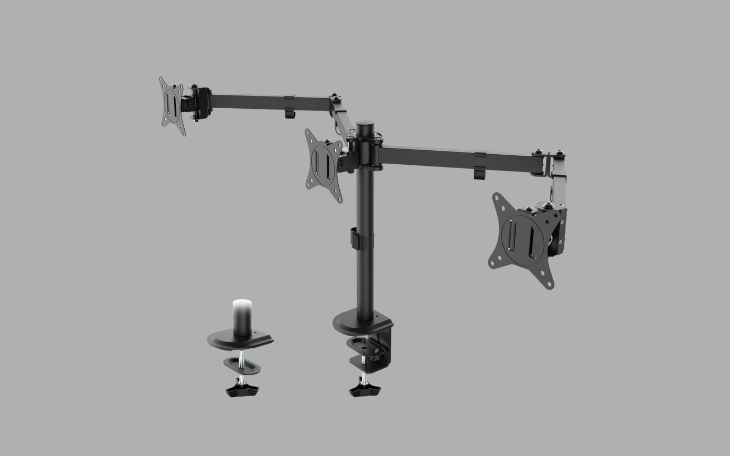 A Triple Monitor Mount is a high-performance mounting solution designed to support three monitors in a stable, ergonomic, and space-saving setup. Ideal for office professionals, traders, programmers, gamers, and content creators, it allows for efficient multitasking and an immersive viewing experience. Constructed from durable metal or reinforced materials, it ensures long-lasting stability and support for monitors of various sizes. Most models feature height adjustment, tilt, swivel, and full 360° rotation, enabling flexible positioning to reduce neck strain and improve posture. Some mounts include gas spring arms for smooth, effortless adjustments, while others have a fixed stand with articulating arms for precise screen alignment. Integrated cable management keeps wires organized and minimizes desk clutter, creating a clean and professional workspace. Compatible with VESA-standard monitors, a Triple Monitor Mount supports multiple configurations, such as side-by-side or stacked layouts. Whether for work, gaming, or creative tasks, it enhances productivity, comfort, and visual efficiency. Before installation, ensure monitor compatibility, weight capacity, and mounting surface suitability for a secure setup.